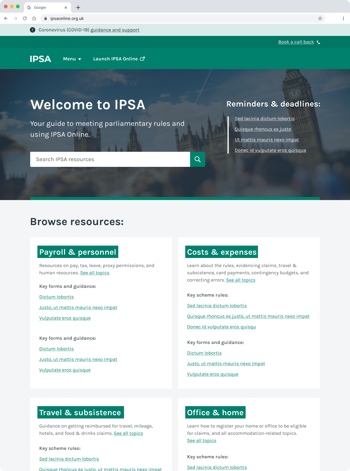 The focus was on allowing MPs to get the information they needed as easily as possible. Multiple levels of the information architecture are available from the Home page and imagery was kept to a minimum.