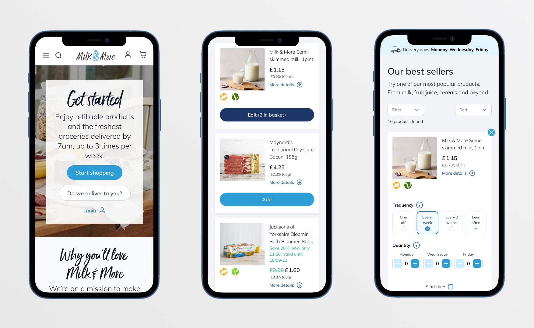 The homepage offers a smooth start for both new and returning users, with options to check availability via postcode or log in directly. First-time users are guided by a clear step-by-step introduction to Milk & More, supported by helpful info icons. As users browse product pages, intuitive selection cards and a visible 3-day delivery banner reinforce trust in the service.